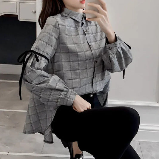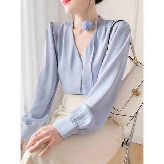 Satin Button New Vintage Long Sleeve Polo Collar Blouse