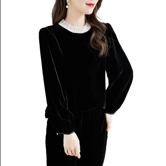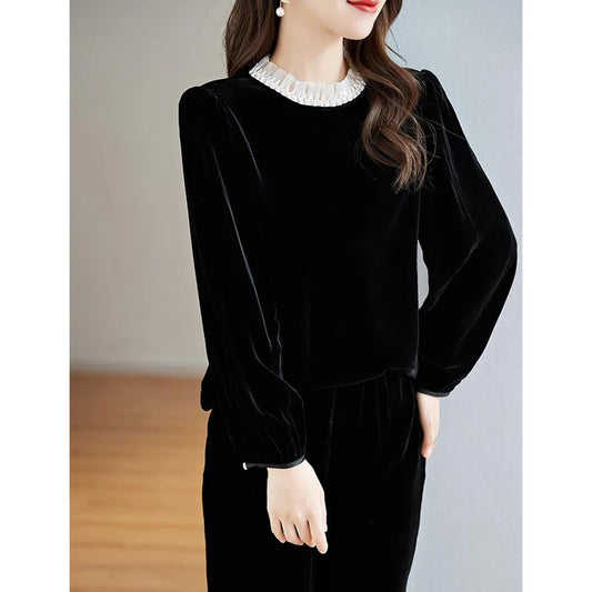 Gold Velvet Top Fold Flounce Pullover Loose T-shirt