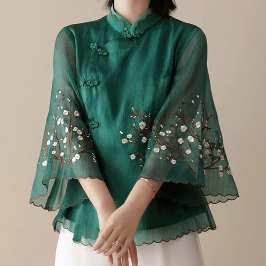 Modified Cheongsam Stand Collar Bat Sleeve Blouse